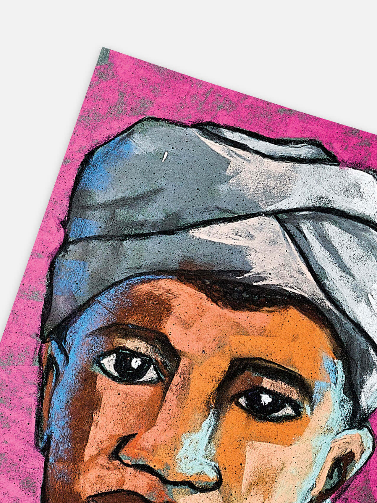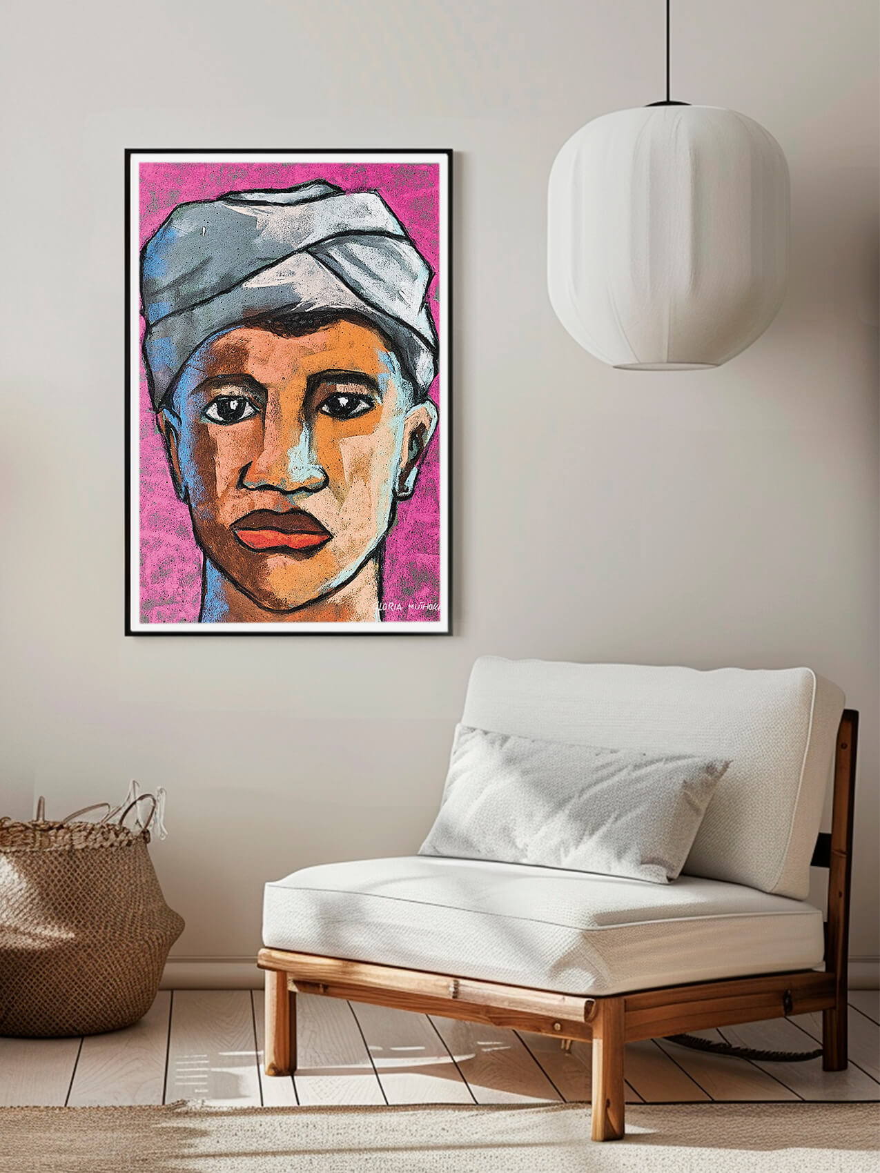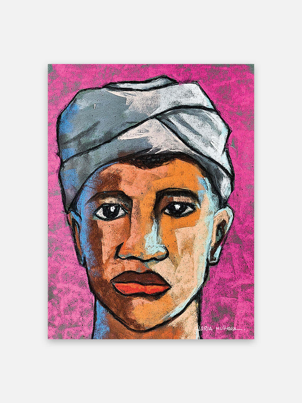 “Mama Samaki – de geliefde visverkoopster op de markt. Je kent haar wel: de vrouw in het kleine, door roet bevlekte kraampje met een borrelende wok vol vis en hete olie. Maar achter haar kraam schuilt een leven vol verhalen. Ze is niet alleen een handelaar; ze is een moeder, een zus, een grootmoeder, verweven in een uitgebreid netwerk van vissers, verkopers, kopers en meer. Haar handel in gefrituurde vis is niet zomaar een baan, maar een essentiële schakel in de Keniaanse economie. Door haar doorleefde handen, getekend door jaren van het schoonmaken van vis en littekens van talloze brandwonden, belichaamt Mama Samaki veerkracht en gemeenschap. Deze overpeinzingen nodigen ons uit om verder te kijken dan haar kraam en het complexe web van levens en verhalen te waarderen die samenkomen op haar markthoek, waardoor niet alleen onze tafels worden verrijkt, maar ook ons begrip van haar wereld.” Gloria Muthoka is een Keniaanse beeldend kunstenaar die zowel traditionele als digitale kunst beoefent. Door verhalen te visualiseren via kunst, verkent en geniet ze van de verfijning van het artistieke proces. Haar werk is levendig en veelzijdig, geïnspireerd door de sociaal-culturele dynamiek van de samenleving.